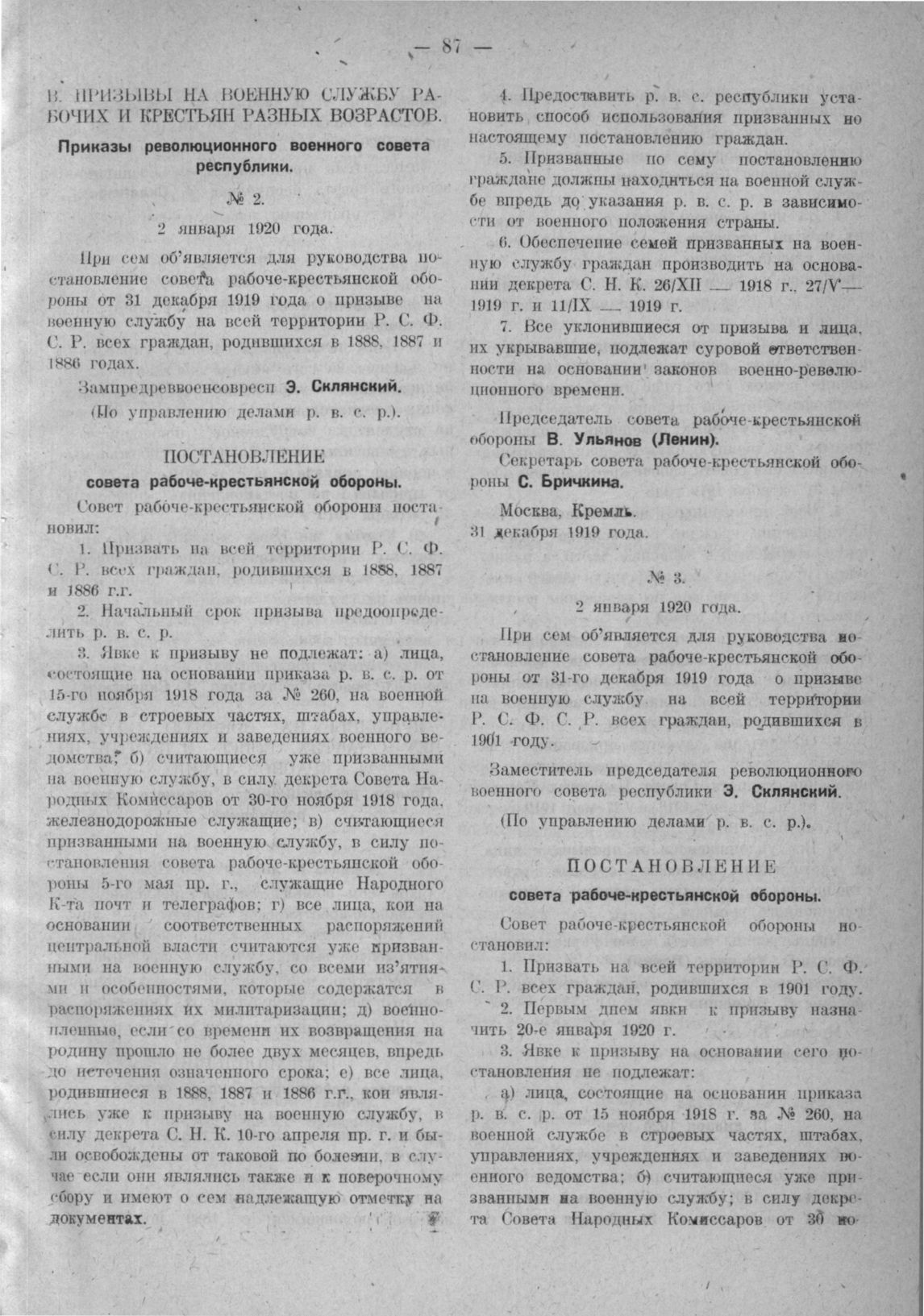 Приказ революционного военного совета республики (По управлению делами р. в. с. р). № 3. 2 января 1920 года