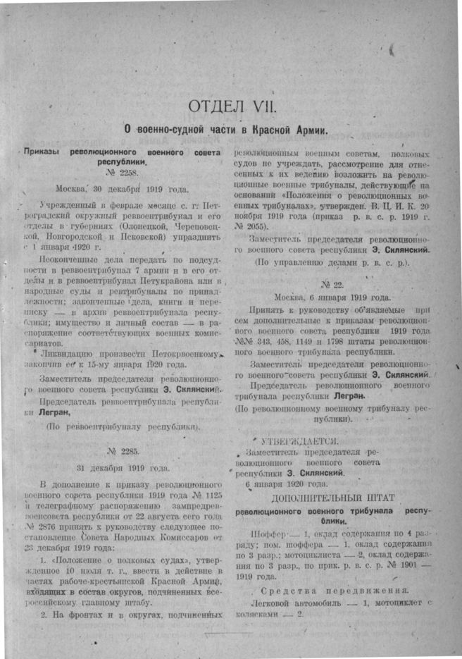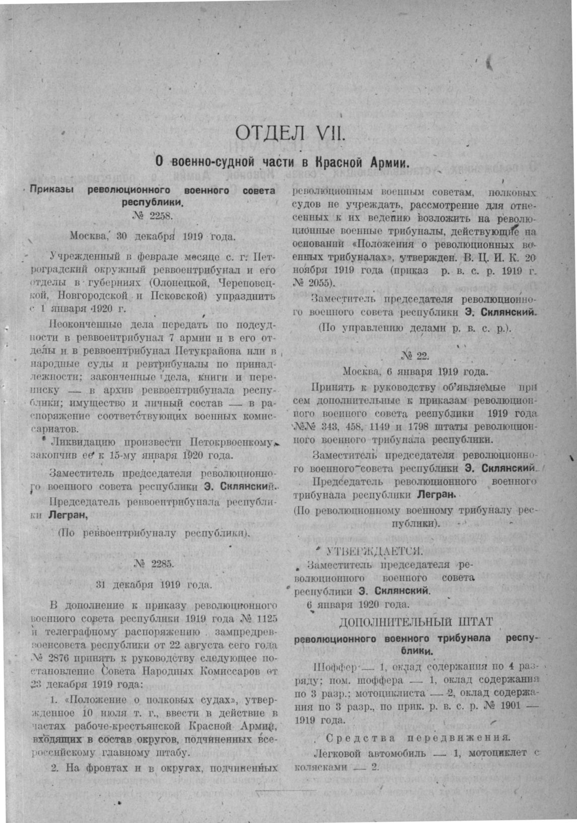 Приказ революционного военного совета республики (По управлению делами р. в. с. р.). № 2285. 31 декабря 1919 года