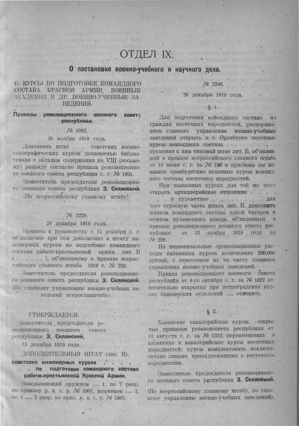 Приказ революционного военного совета республики (По главному управлению военно-учебных заведений всероглавштаба). № 2229. 24 декабря 1919 года