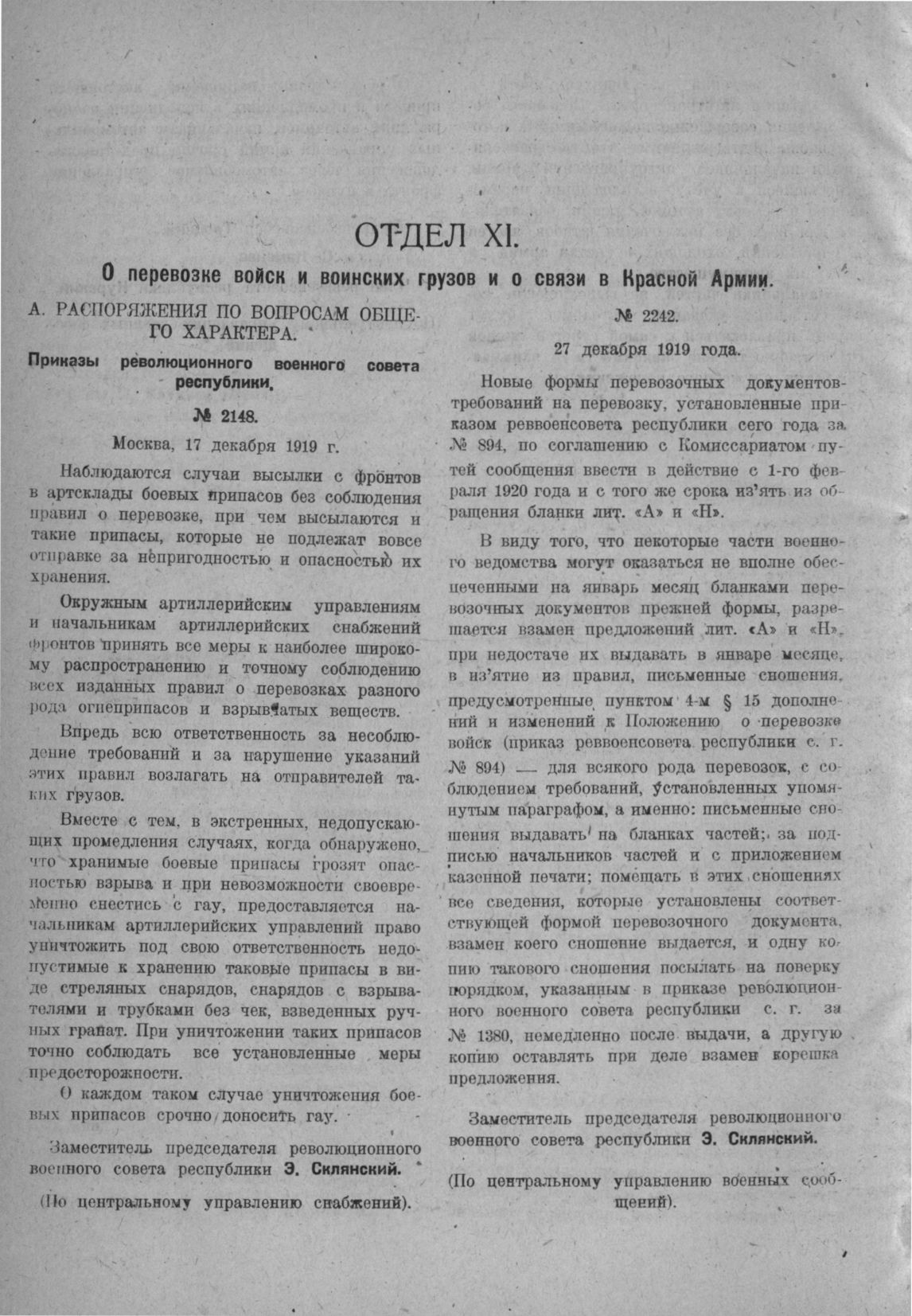 Приказ революционного военного совета республики (По центральному управлению снабжений). № 2148. Москва, 17 декабря 1919 г.
