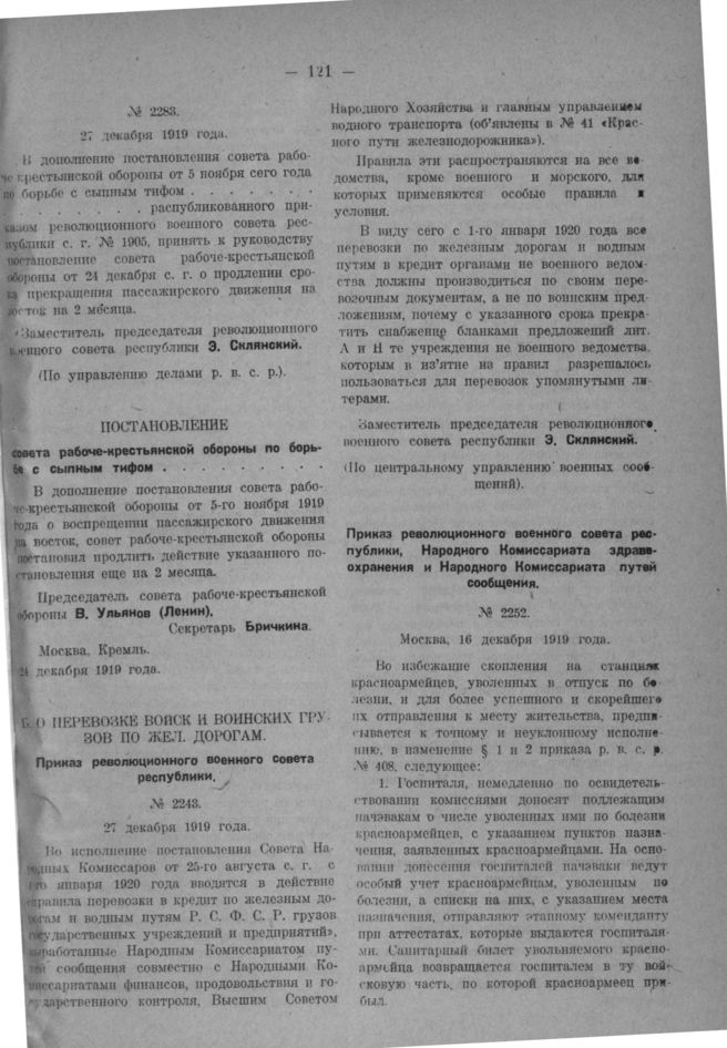 Приказ революционного военного совета республики (По центральному управлению военных сообщений). № 2243. 27 декабря 1919 года