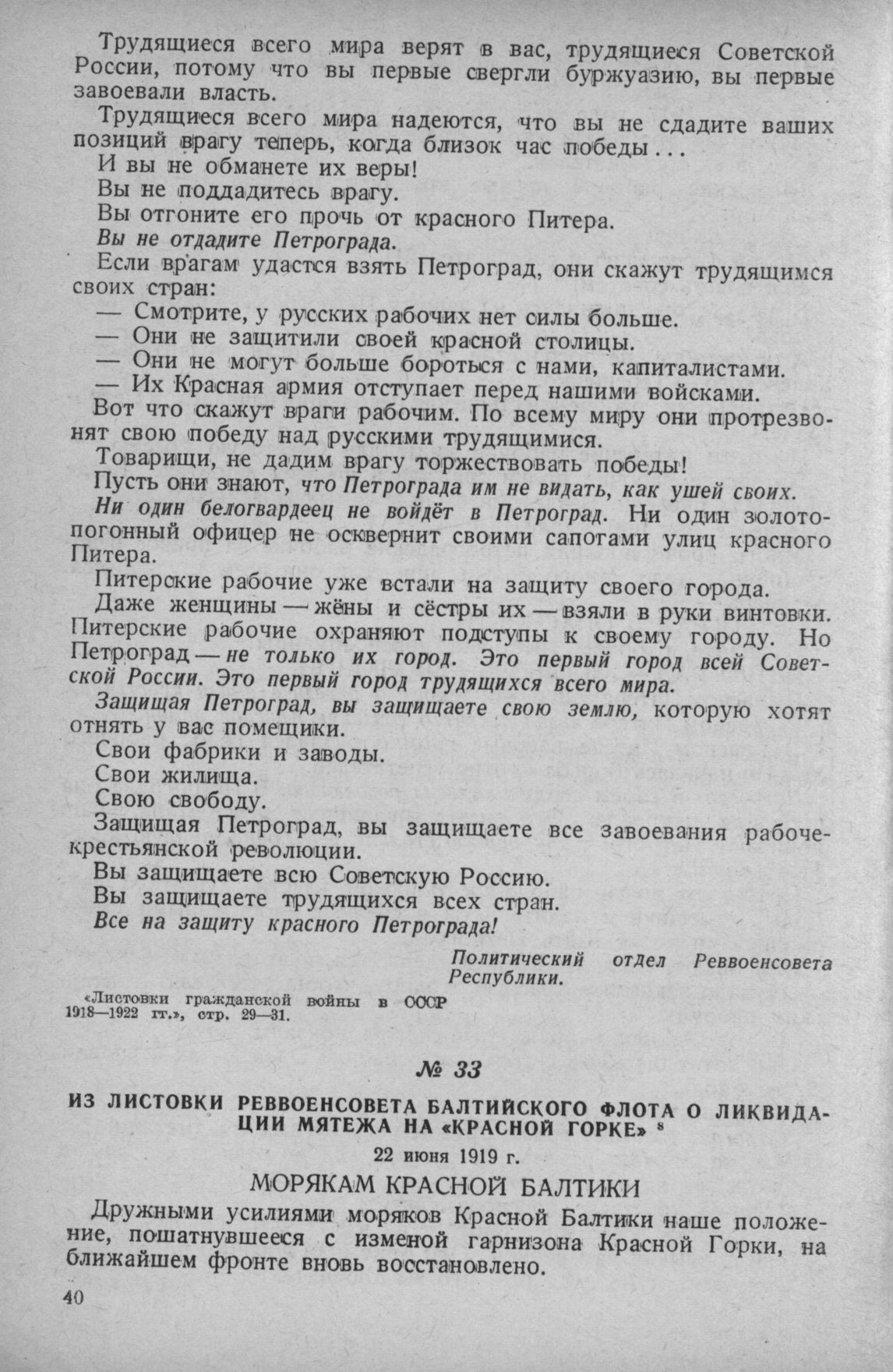 Из листовки Реввоенсовета Балтийского флота о ликвидации мятежа на «Красной Горке». 22 июня 1919 г. // Ленинградская Государственная публичная библиотека им. Салтыкова-Щедрина.