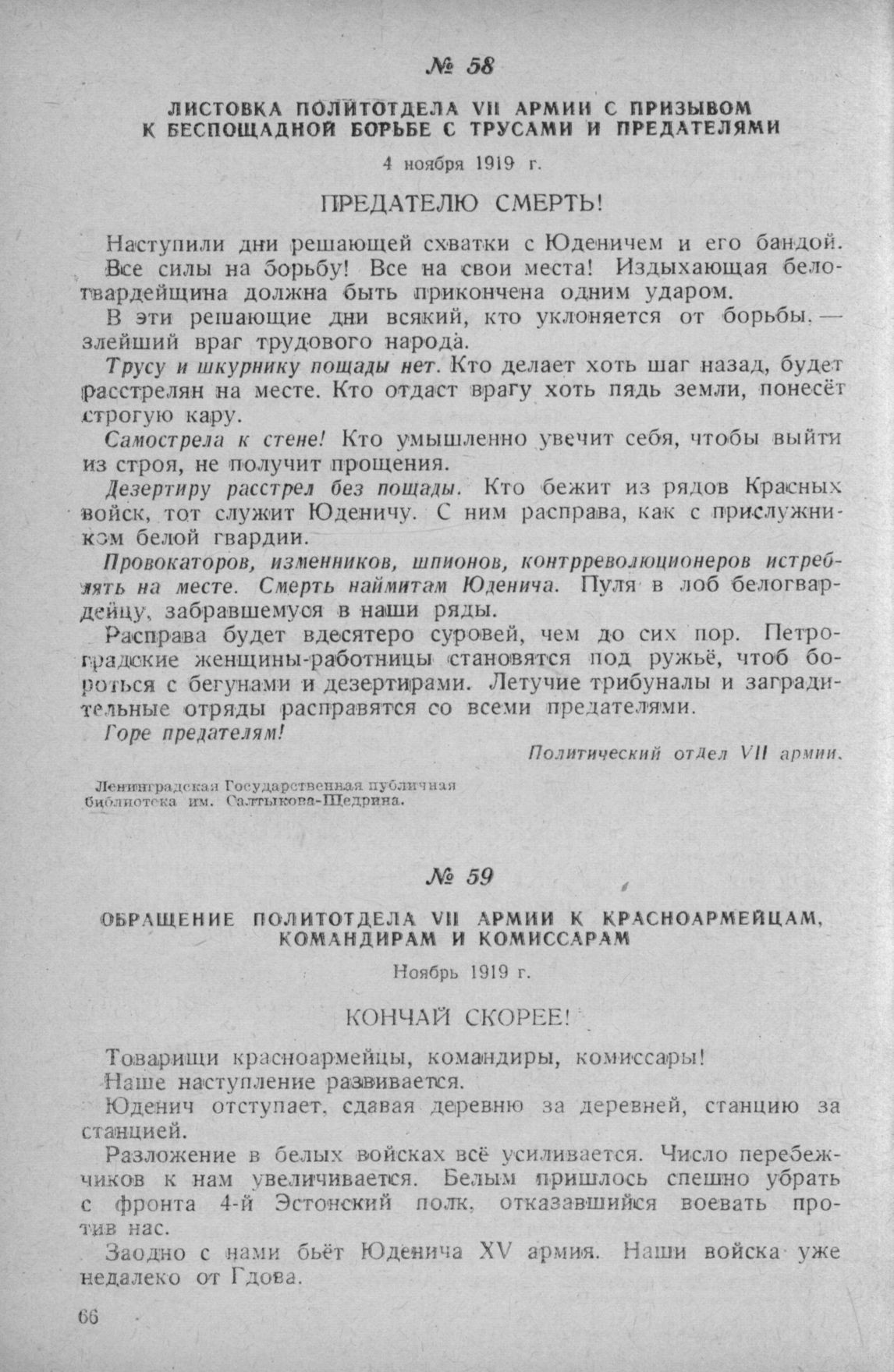 Обращение Политотдела VII армии к красноармейцам, командирам и комиссарам. Ноябрь 1919 г. // «Листовки гражданской войны в СССР 1918—1922 гг.», стр. 42.