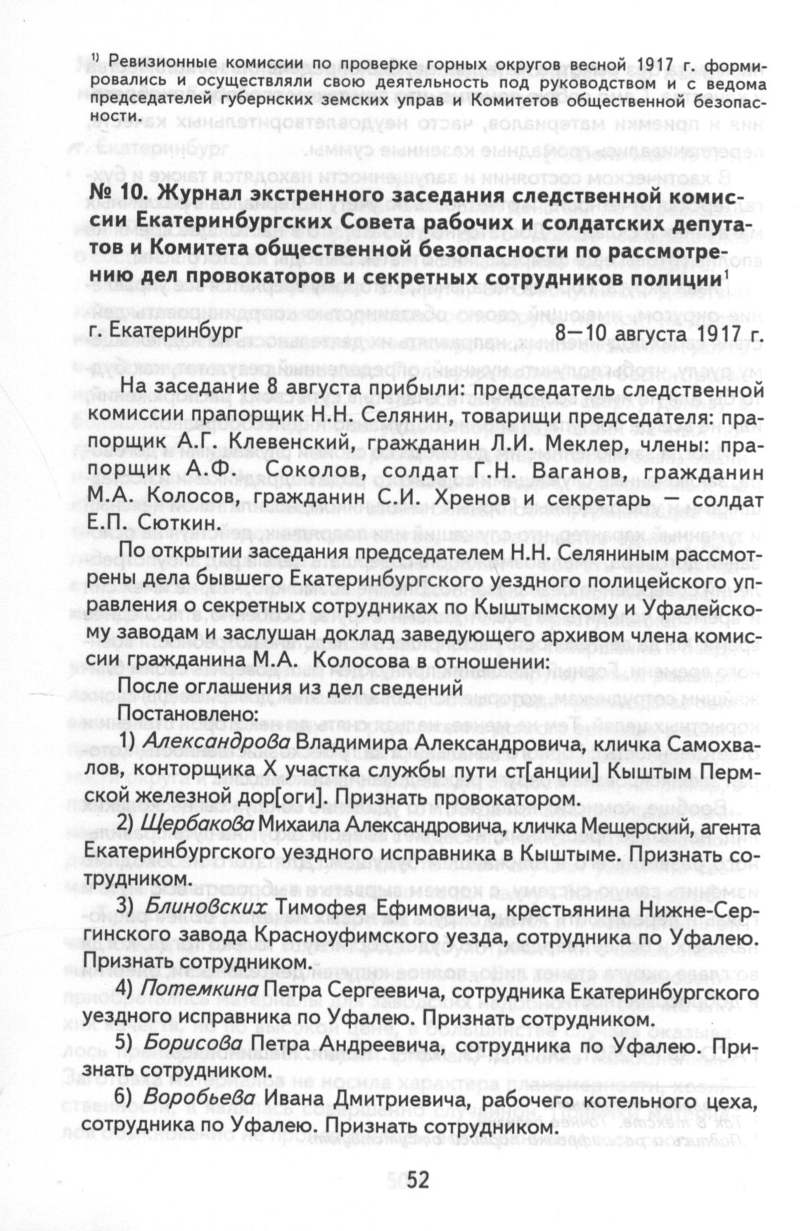 Журнал экстренного заседания следственной комиссии Екатеринбургских Совета рабочих и солдатских депутатов и Комитета общественной безопасности по рассмотрению дел провокаторов и секретных сотрудников полиции. г. Екатеринбург, 8-10 августа 1917 г. // ГАСО. Ф. Р-1198. Оп. 1. Д. 37. Л. 11—11а. Копия. Машинопись.
