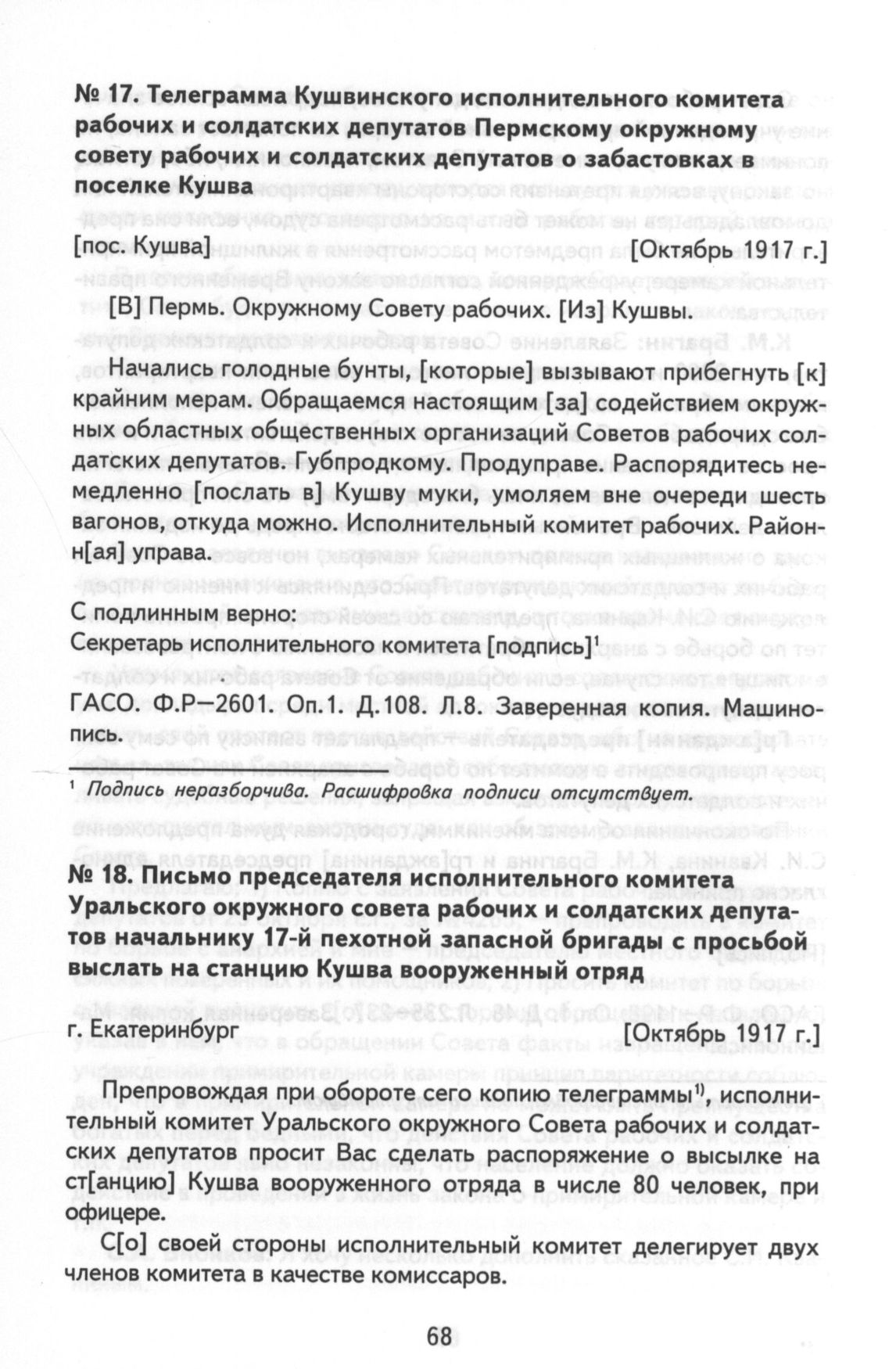 Телеграмма Кушвинского исполнительного комитета рабочих и солдатских депутатов Пермскому окружному совету рабочих и солдатских депутатов о забастовках в поселке Кушва. пос. Кушва, октябрь 1917 г. // ГАСО. Ф. Р—2601. Оп. 1. Д. 108. Л. 8. Заверенная копия. Машинопись.