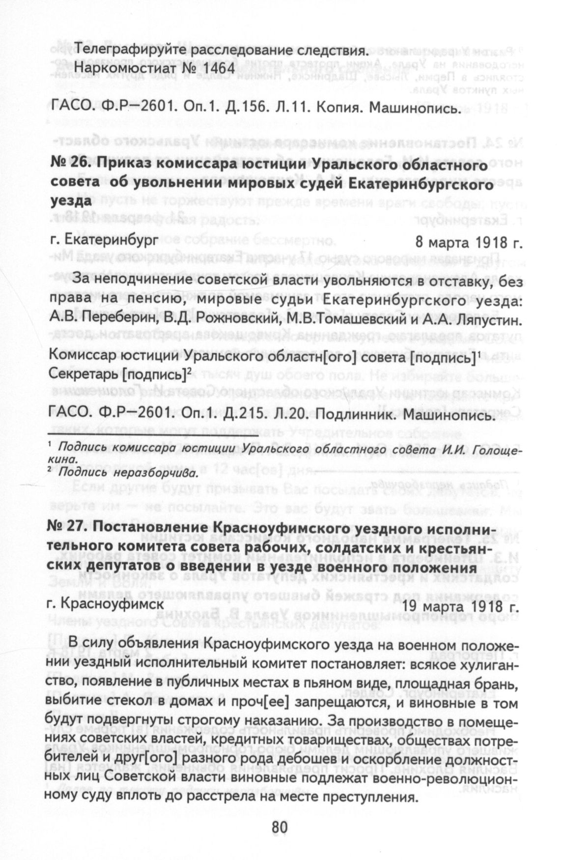 Приказ комиссара юстиции Уральского областного совета об увольнении мировых судей Екатеринбургского уезда. г. Екатеринбург, 8 марта 1918 г. // ГАСО. Ф. Р—2601. Оп. 1. Д. 215. Л. 20. Подлинник. Машинопись.