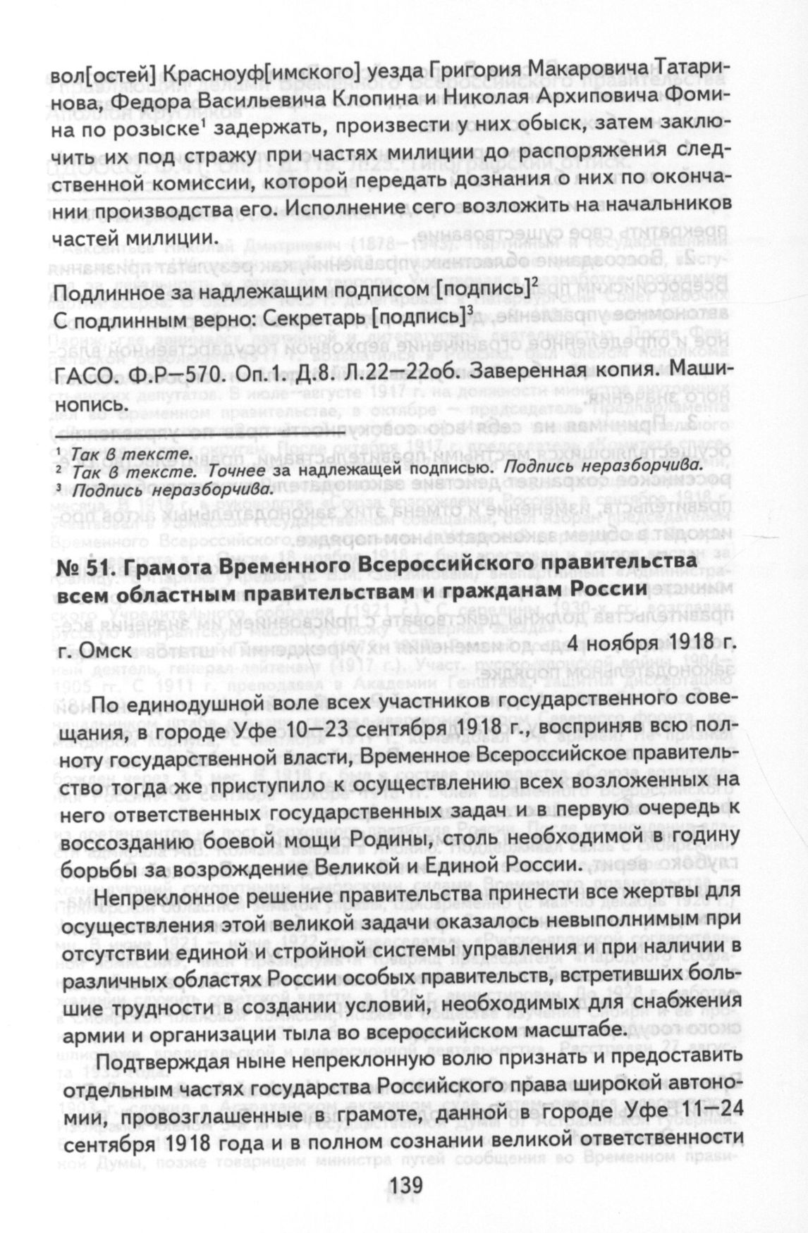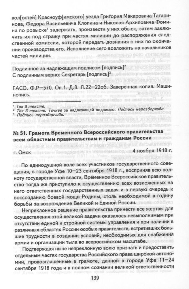Грамота Временного Всероссийского правительства всем областным правительствам и гражданам России. г. Омск, 4 ноября 1918 г. // ЦДООСО. Ф. 41. Оп. 1. Д. 119. Л. 25. Типографский оттиск.
