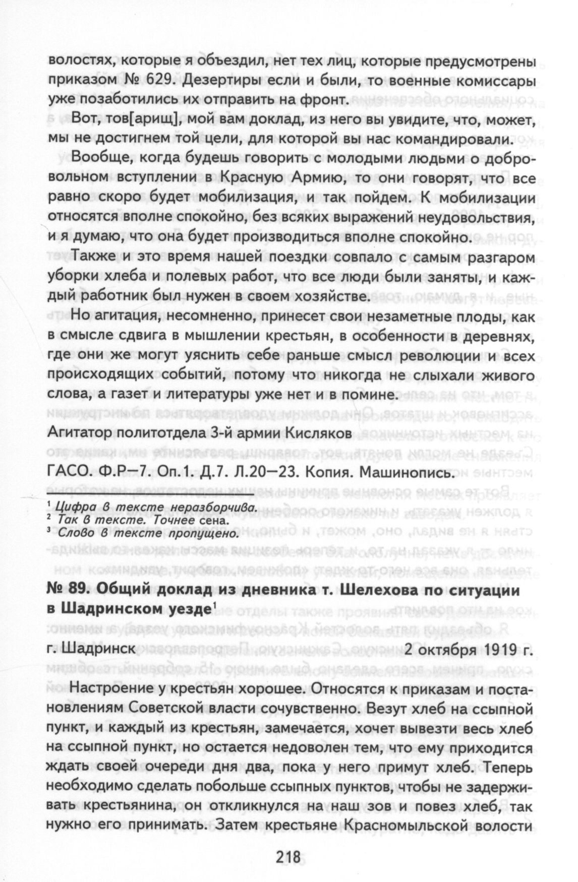 Общий доклад из дневника т. Шелехова по ситуации в Шадринском уезде. г. Шадринск, 2 октября 1919 г. // ГАСО. Ф. Р-7. Оп. 1. Д. 7. Л. 24. Заверенная копия. Машинопись. 123