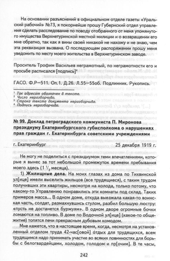 Доклад петроградского коммуниста П. Миронова президиуму Екатеринбургского губисполкома о нарушениях прав граждан г. Екатеринбурга советскими учреждениями. г. Екатеринбург, 25 декабря 1919 г.