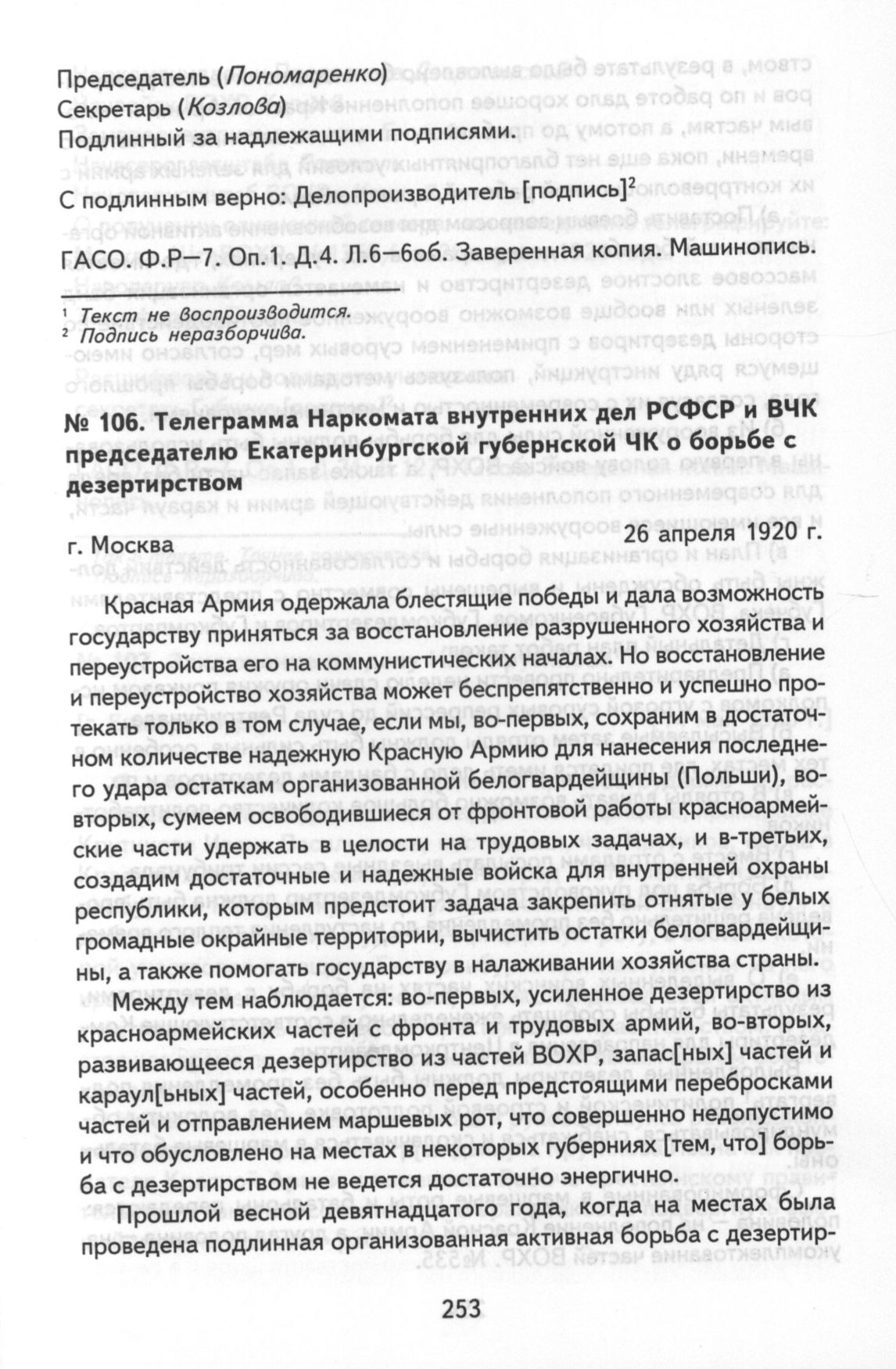 Телеграмма Наркомата внутренних дел РСФСР и ВЧК председателю Екатеринбургской губернской ЧК о борьбе с дезертирством. г. Москва, 26 апреля 1920 г. // ГАСО. Ф. Р—7. Оп. 1. Д. 21. Л.127-127 об. Заверенная копия. Машинопись.