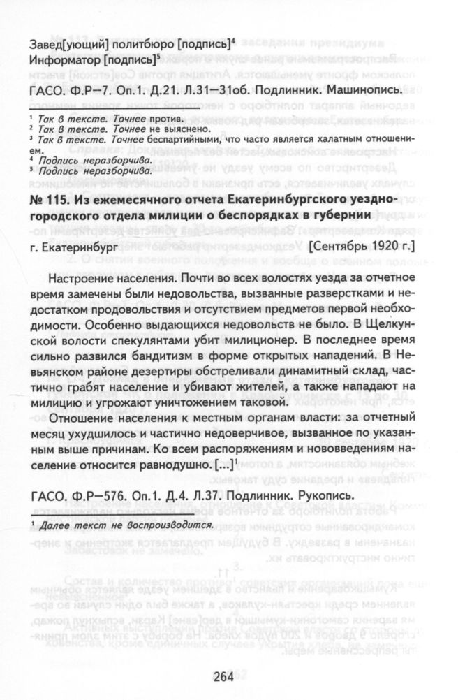 Из ежемесячного отчета Екатеринбургского уездно-городского отдела милиции о беспорядках в губернии. г. Екатеринбург, сентябрь 1920 г. // ГАСО. Ф. Р-576. Оп. 1. Д. 4. Л. 37. Подлинник. Рукопись.