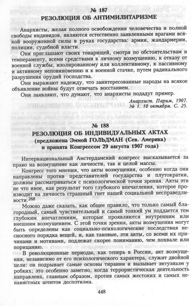 Резолюция об антимилитаризме // Анархист. [Париж], 1907. № 1. 10 октября. С. 25.