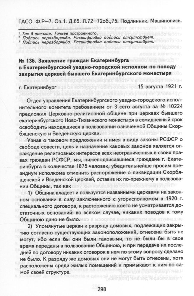 Заявление граждан Екатеринбурга в Екатеринбургский уездно-городской исполком по поводу закрытия церквей бывшего Екатеринбургского монастыря. г. Екатеринбург, 15 августа 1921 г.