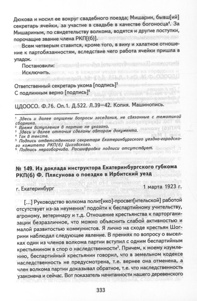 Из доклада инструктора Екатеринбургского губкома РКП(б) Ф. Плясунова о поездке в Ирбитский уезд. г. Екатеринбург, 1 марта 1923 г. // ЦДООСО. Ф. 76. Оп. 1. Д. 475. Л. 63-64. Подлинник. Рукопись.