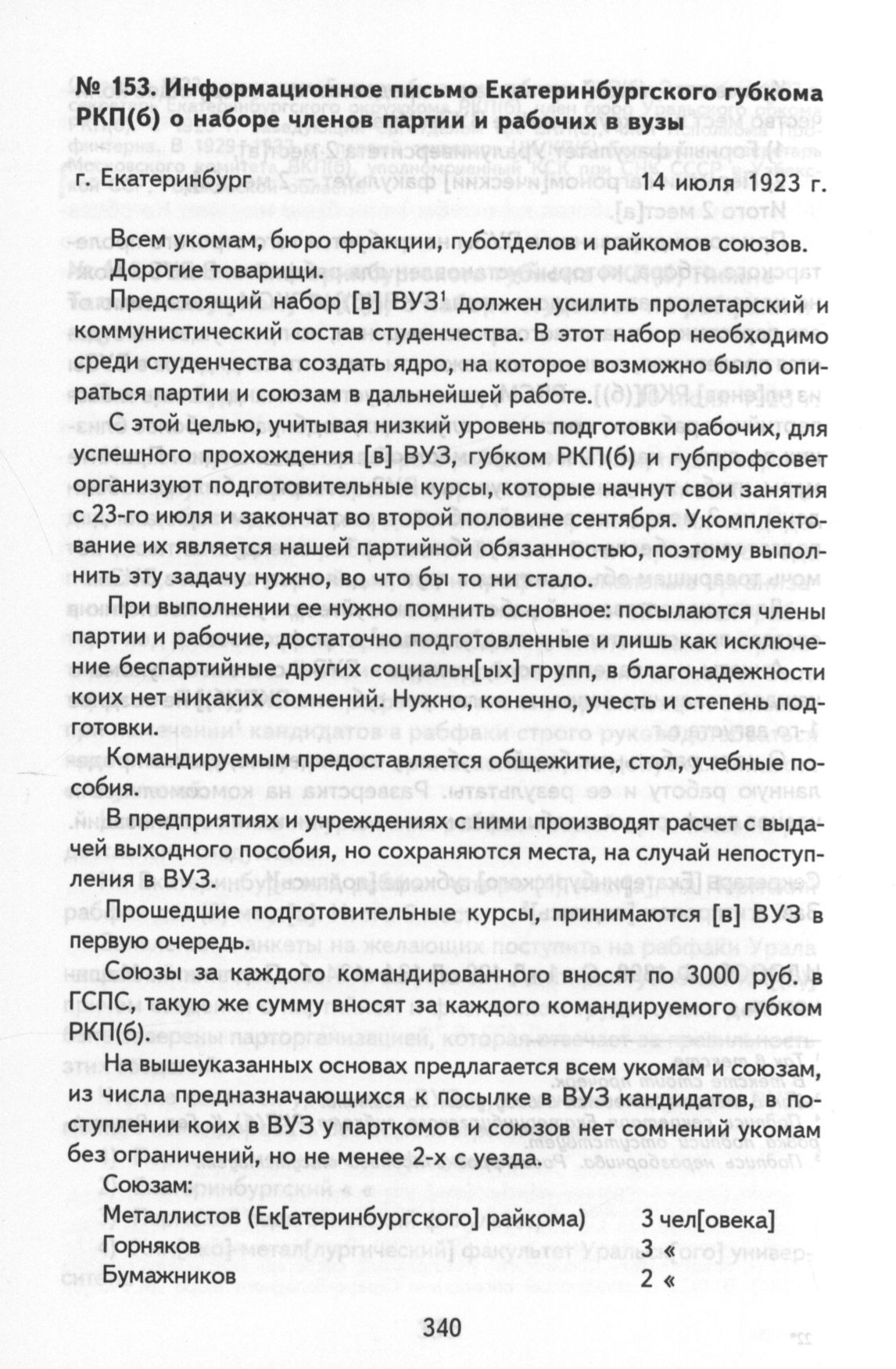 Информационное письмо Екатеринбургского губкома РКП(б) о наборе членов партии и рабочих в вузы. г. Екатеринбург, 14 июля 1923 г. // ЦДООСО. Ф. 1398. Оп. 1. Д. 429. Л. 133. Подлинник. Машинопись.