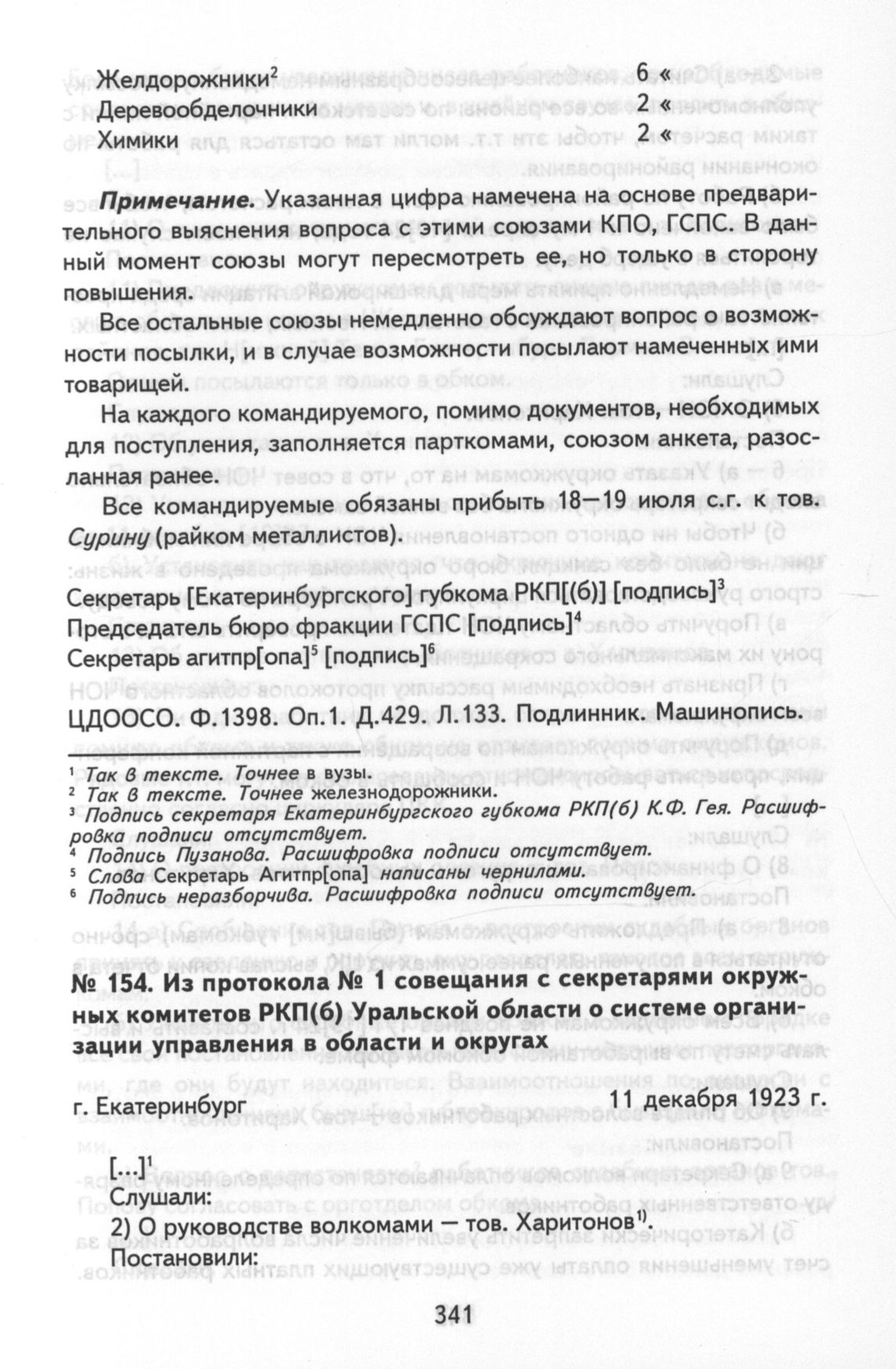 Из протокола № 1 совещания с секретарями окружных комитетов РКП(б) Уральской области о системе организации управления в области и округах. г. Екатеринбург, 11 декабря 1923 г.