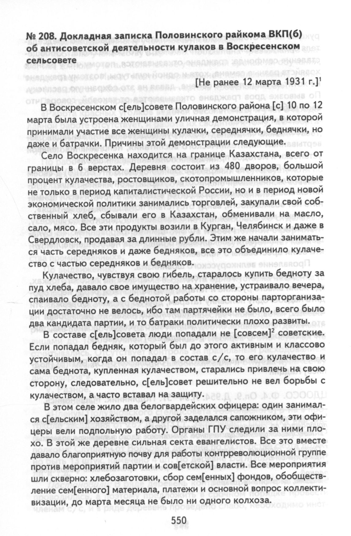 Докладная записка Половинского райкома ВКП(б) об антисоветской деятельности кулаков в Воскресенском сельсовете. Не ранее 12 марта 1931 г. // ЦДООСО. Ф. 4. Оп. 9. Д. 954. Л. 101-105. Подлинник. Машинопись.