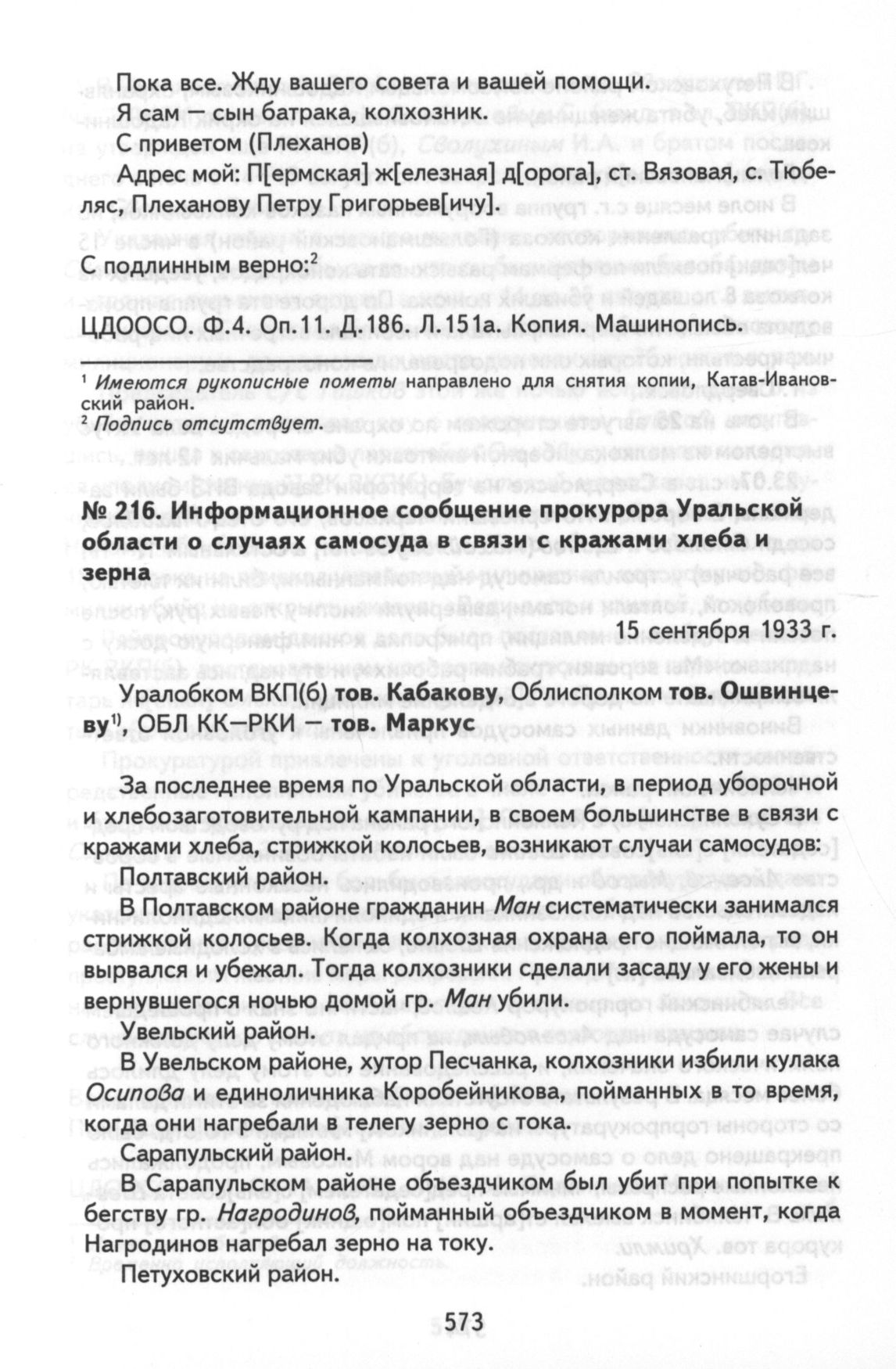 Информационное сообщение прокурора Уральской области о случаях самосуда в связи с кражами хлеба и зерна. 15 сентября 1933 г. // ЦДООСО. Ф. 4. Оп. 11. Д. 196. Л. 49-52. Подлинник. Машинопись.