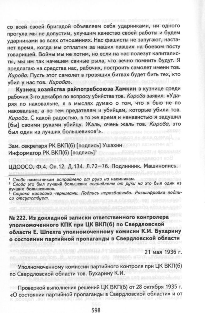 Из докладной записки ответственного контролера уполномоченного КПК при ЦК ВКП(б) по Свердловской области Е. Шпехта уполномоченному комисии К.И. Бухарину о состоянии партийной пропаганды в Свердловской области. 21 мая 1936 г. // ЦДООСО. Ф. 4. Оп. 14. Д. 219. Л. 2, 21-30. Подлинник. Машинопись.