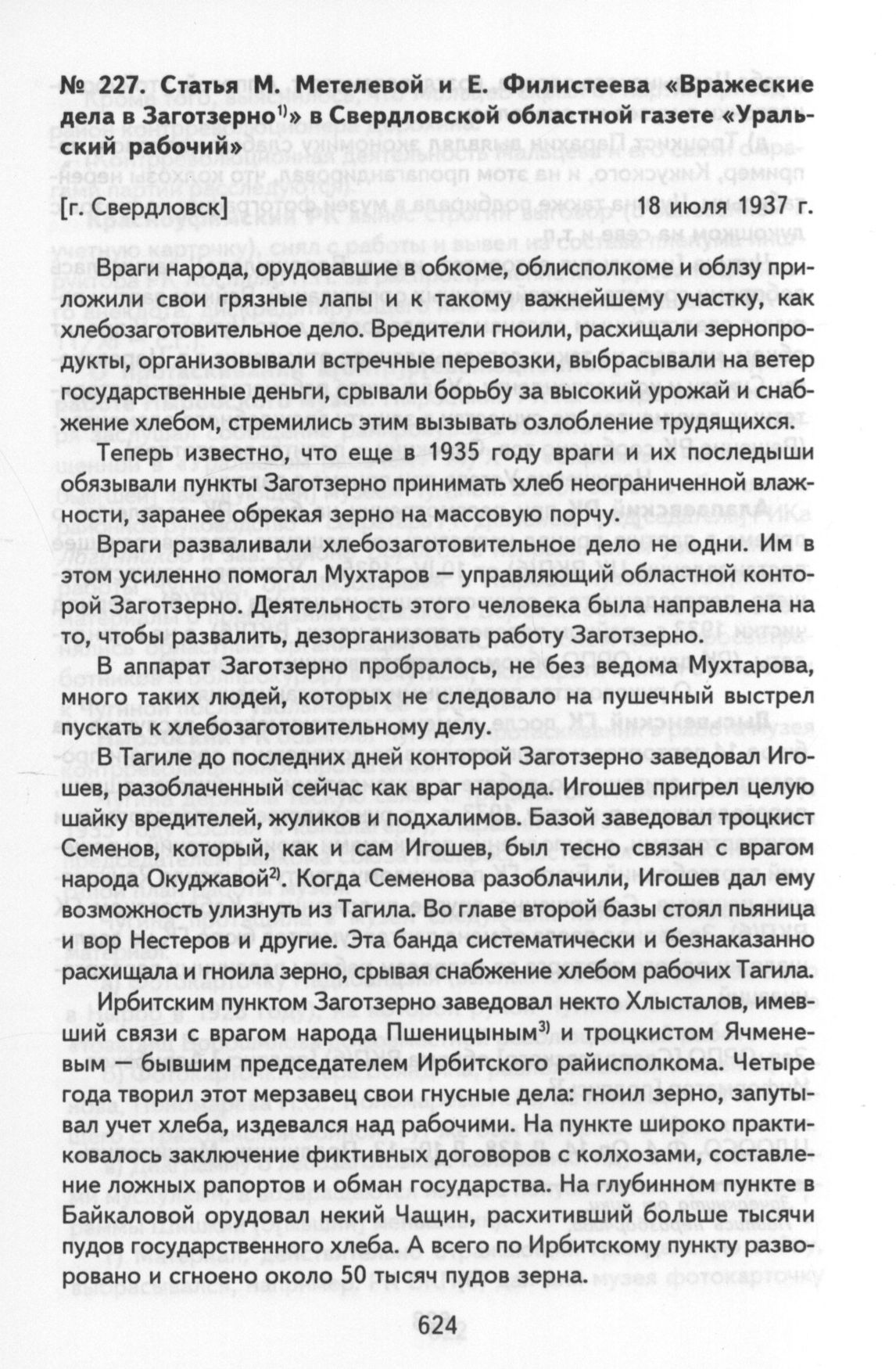 Статья M. Метелевой и Е. Филистеева «Вражеские дела в Заготзерно”» в Свердловской областной газете «Уральский рабочий». г. Свердловск, 18 июля 1937 г. // Уральский рабочий. 1937. 18 июля. С.3.