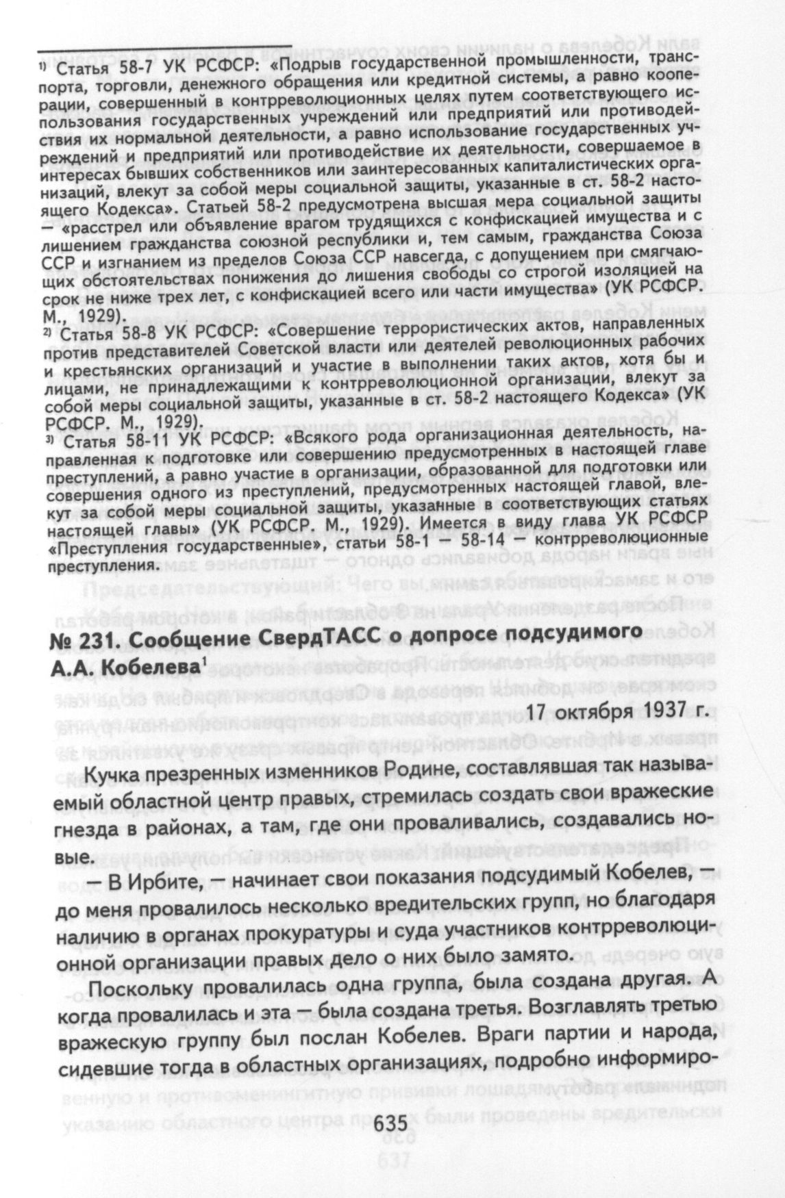 Сообщение СвердТАСС о допросе подсудимого А.А. Кобелева. 17 октября 1937 г. // Уральский рабочий. 1937. 17 октября. С. 3.