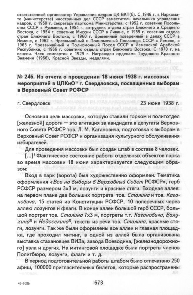 Из отчета о проведении 18 июня 1938 г. массовых мероприятий в ЦПКиО г. Свердловска, посвященных выборам в Верховный Совет РСФСР. г. Свердловск, 23 июня 1938 г. // ЦДООСО. Ф. 161. Оп. 6. Д. 563. Л. 80-103. Копия. Машинопись.