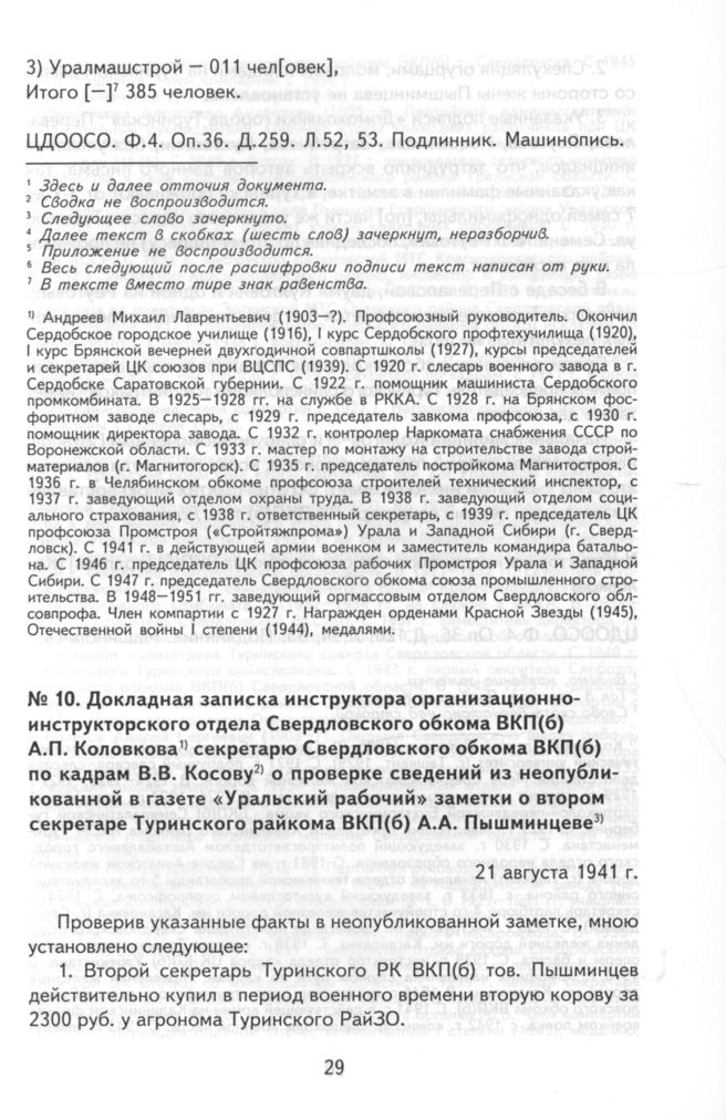Докладная записка инструктора организационно-инструкторского отдела Свердловского обкома ВКП(б) А.П. Коловкова секретарю Свердловского обкома ВКП(б) по кадрам В.В. Косову о проверке сведений из неопубликованной в газете «Уральский рабочий» заметки о втором секретаре Туринского райкома ВКП(б) А.А. Пышминцеве. 21 августа 1941 г. // ЦДООСО. Ф. 4. Оп. 36. Д. 126. Л. 94, 95. Подлинник. Машинопись.