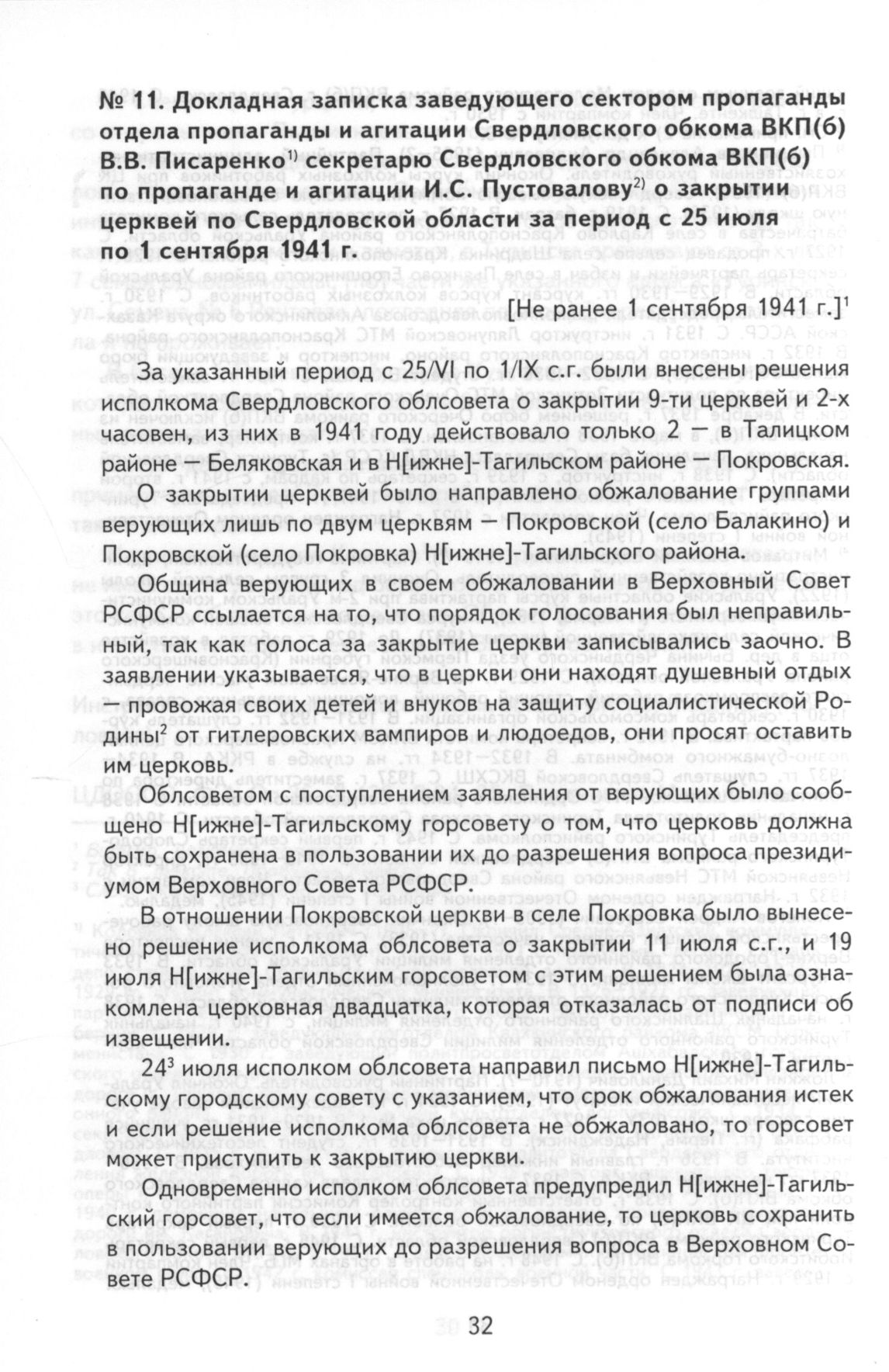 Докладная записка заведующего сектором пропаганды отдела пропаганды и агитации Свердловского обкома ВКП(б) В.В. Писаренко секретарю Свердловского обкома ВКП(б) по пропаганде и агитации И.С. Пустовалову о закрытии церквей по Свердловской области за период с 25 июля по 1 сентября 1941 г. Не ранее 1 сентября 1941 г. // ЦДООСО. Ф. 4. Оп. 37. Д. 170. Л. 33, 34. Подлинник. Машинопись.