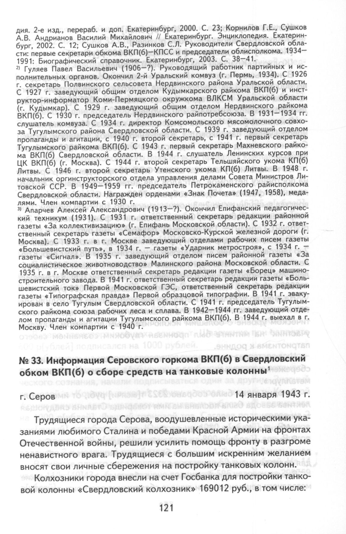 Информация Серовского горкома ВКП(б) в Свердловский обком ВКП(б) о сборе средств на танковые колонны. г. Серов, 14 января 1943 г. // ЦДООСО. Ф. 4. Оп. 38. Д. 119. Л. 6-9. Подлинник. Машинопись.