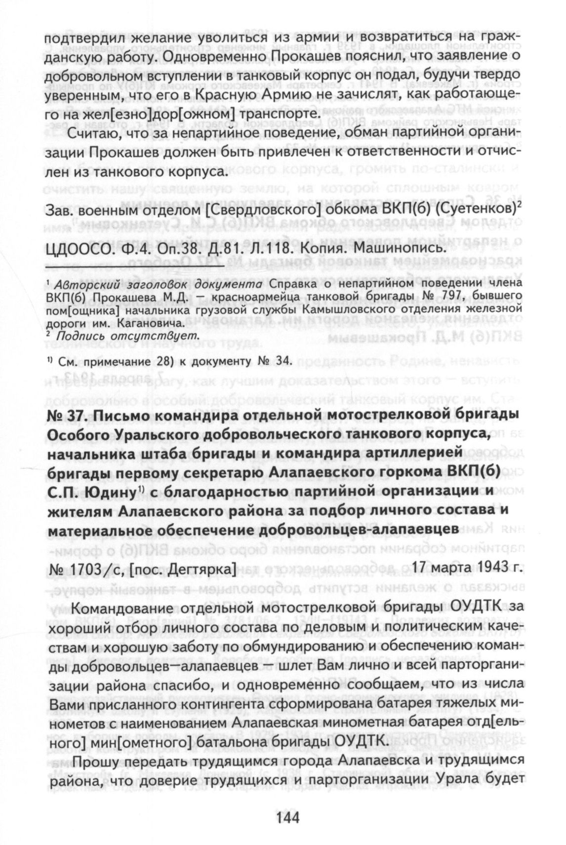 Письмо командира отдельной мотострелковой бригады Особого Уральского добровольческого танкового корпуса, начальника штаба бригады и командира артиллерией бригады первому секретарю Алапаевского горкома ВКП(б) С.П. Юдину с благодарностью партийной организации и жителям Алапаевского района за подбор личного состава и материальное обеспечение добровольцев-алапаевцев. пос. Дегтярка, 17 марта 1943 г. // ЦДООСО. Ф. 4. Oп. 38. Д. 202. Л. 94. Заверенная копия. Машинопись. Впервые опубликовано: Исторический архив. 2005. № 4. С. 97.