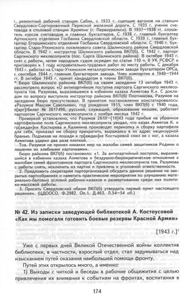 Из записки заведующей библиотекой А. Костоусовой «Как мы помогали готовить боевые резервы Красной Армии». 1943 г. // ГАСО. Ф. Р-2089. Оп. 1. Д. 10. Л. 218-219. Подлинник. Машинопись.