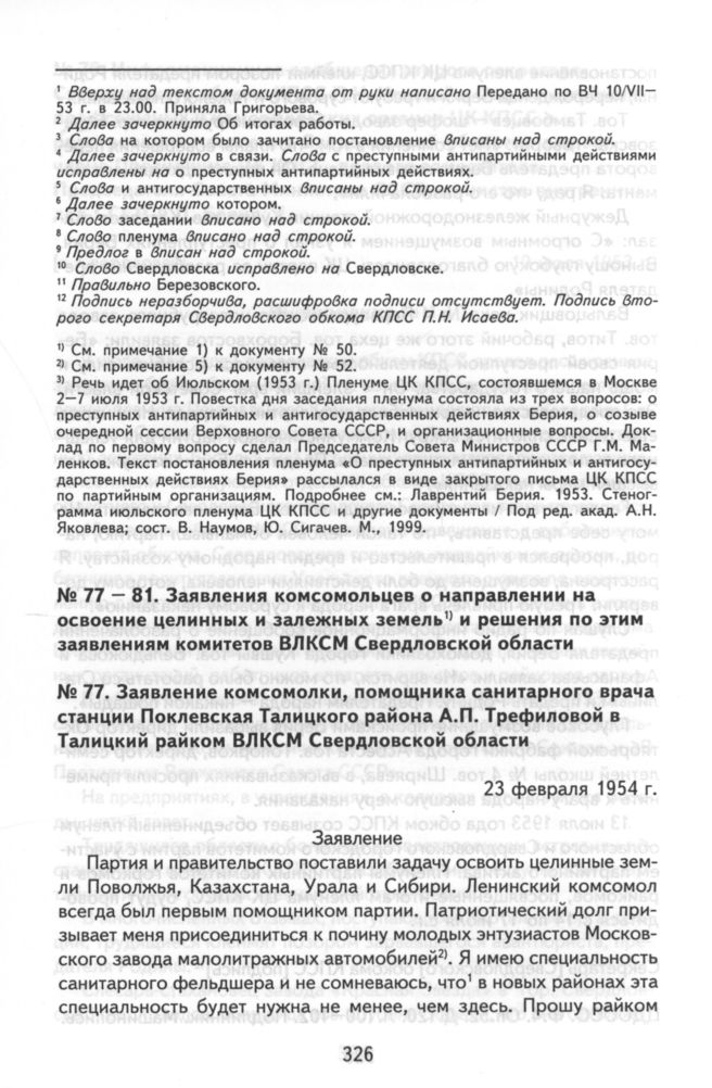Заявление комсомолки, помощника санитарного врача станции Поклевская Талицкого района А.П. Трефиловой в Талицкий райком ВЛКСМ Свердловской области. 23 февраля 1954 г.