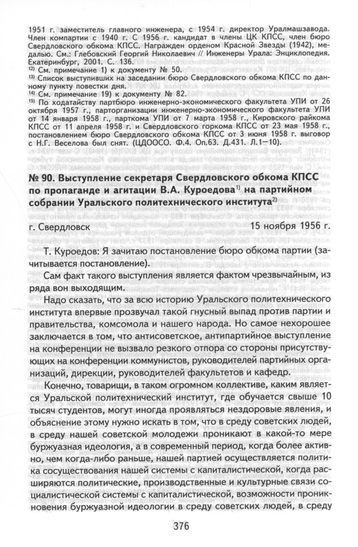 Выступление секретаря Свердловского обкома КПСС по пропаганде и агитации В.А. Куроедова на партийном собрании Уральского политехнического института. г. Свердловск, 15 ноября 1956 г. // ЦДООСО. Ф. 1910. Оп. 5. Д. 11. Л. 234-243. Копия. Машинопись.