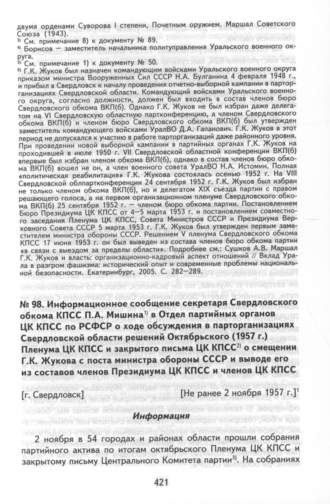 Информационное сообщение секретаря Свердловского обкома КПСС П.А. Мишина в Отдел партийных органов ЦК КПСС по РСФСР о ходе обсуждения в парторганизациях Свердловской области решений Октябрьского (1957 г.) Пленума ЦК КПСС и закрытого письма ЦК КПСС о смещении Г.К. Жукова с поста министра обороны СССР и выводе его из составов членов Президиума ЦК КПСС и членов ЦК КПСС. г. Свердловск, не ранее 2 ноября 1957 г.