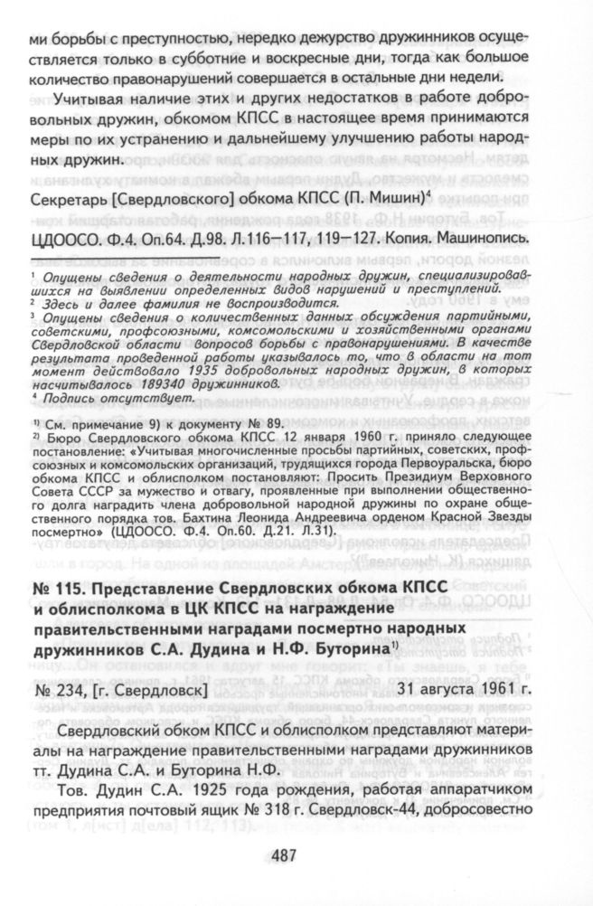 Представление Свердловских обкома КПСС и облисполкома в ЦК КПСС на награждение правительственными наградами посмертно народных дружинников С.А. Дудина Н.Ф. Буторина. г. Свердловск, 31 августа 1961 г. // ЦДООСО. Ф. 4. Оп. 64. Д. 98. Л.131-132. Копия. Машинопись.