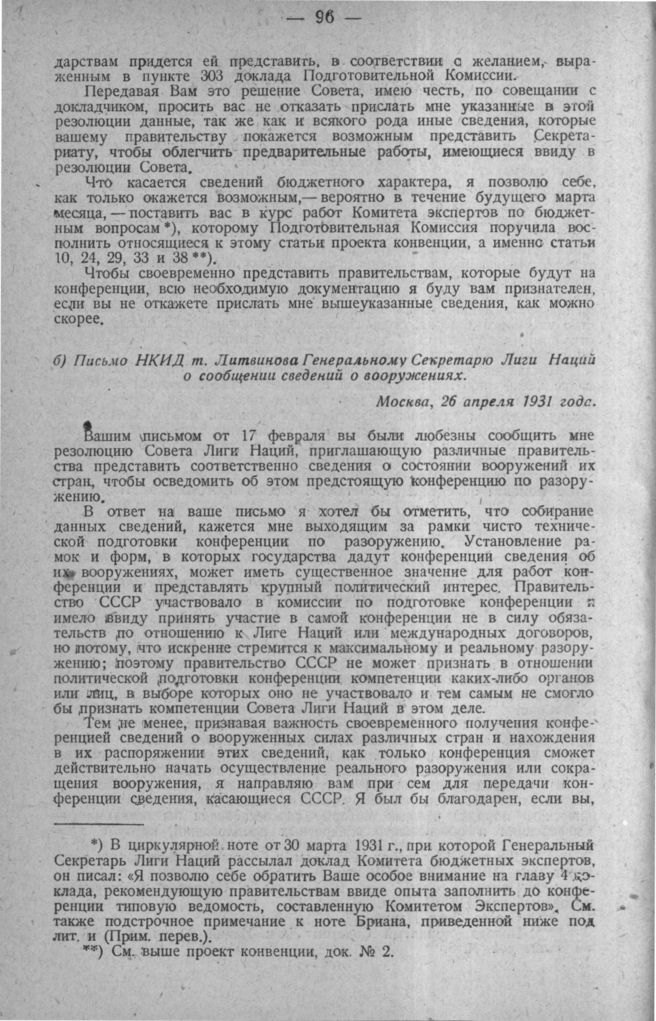 Письмо НКИД т. Литвинова генеральному Секретарю Лиги Наций о сообщении сведений о вооружениях. Москва, 26 апреля 1931 г.