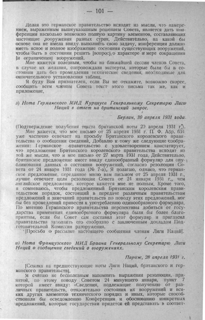 Нота германского МИД Курциуса генеральному Секретарю Лиги Наций в ответ на британский запрос. Берлин, 30 апреля 1931 г.