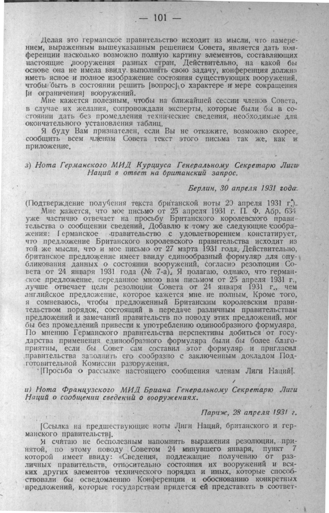 Нота Французского МИД Бриана генеральному Секретарю Лиги Наций о сообщении сведений о вооружениях. Париж, 28 апреля 1931 г.