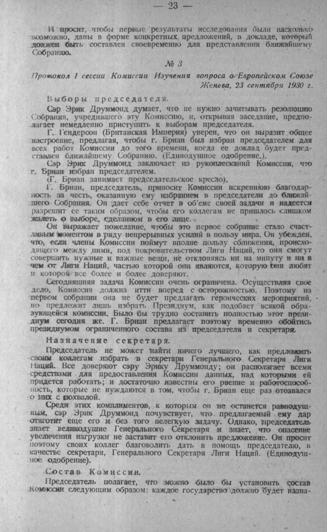 Протокол 1 сессии Комиссии Изучения вопроса о Европейском Союзе. Женева, 23 сентября 1930 г.