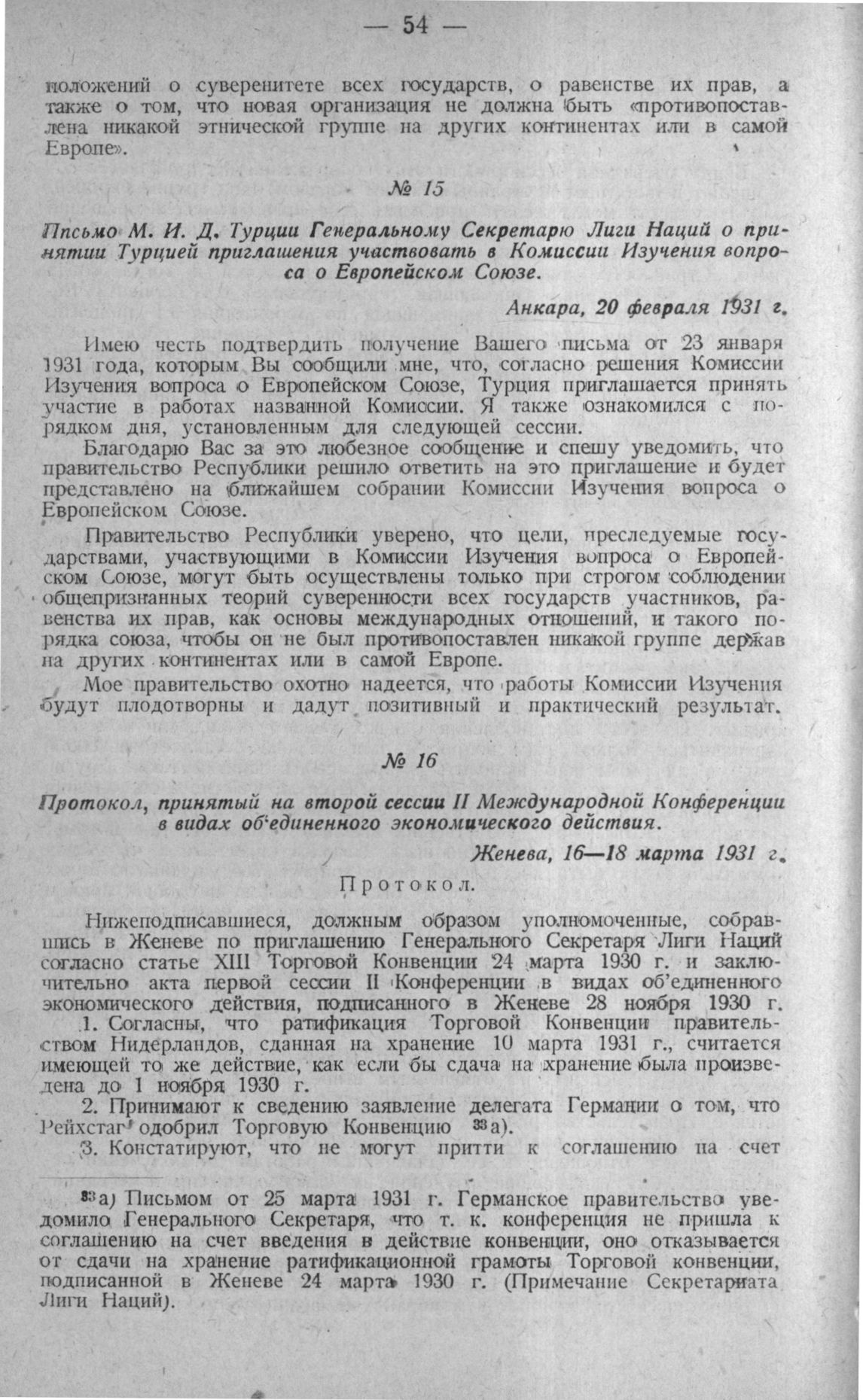 Письмо М.И.Д. Турции Генеральному Секретарю Лиги Наций о принятии Турцией приглашения участвовать в Комиссии Изучения вопроса о Европейском Союзе. Анкара, 20 февраля 1931 г.