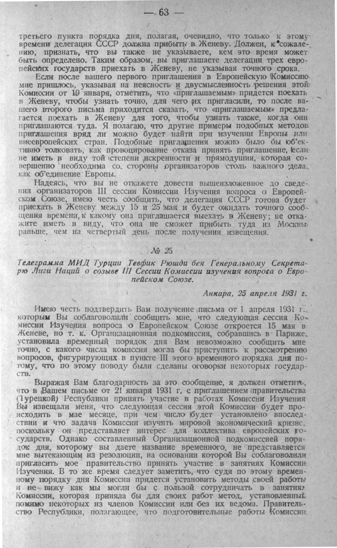 Телеграмма МИД Турции Тевфик Рюшди бея Генеральному Секретарю Лиги Наций о созыве III Сессии Комиссии изучения вопроса о Европейском Союзе. Анкара, 25 апреля 1931 г.