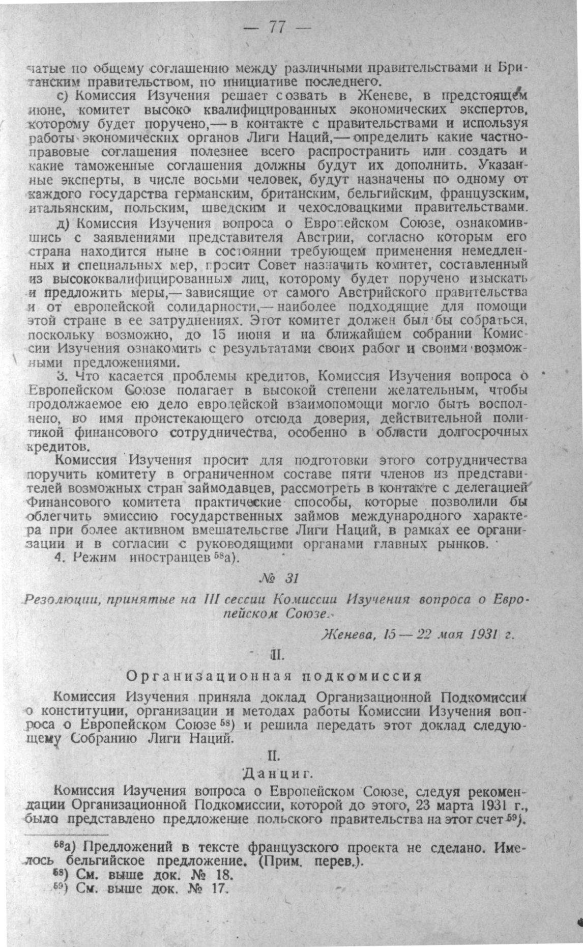 Резолюции, принятые на III сессии Комиссии Изучения вопроса о Европейском Союзе. Женева, 13 — 22 мая 1931 г.