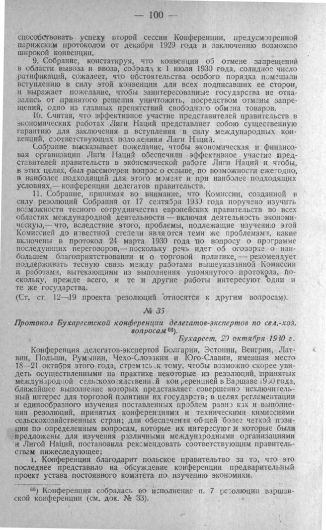 Протокол Бухарестской конференции делегатов-экспертов по сел.-хоз. вопросам. Бухарест, 23 октября 1930 г.