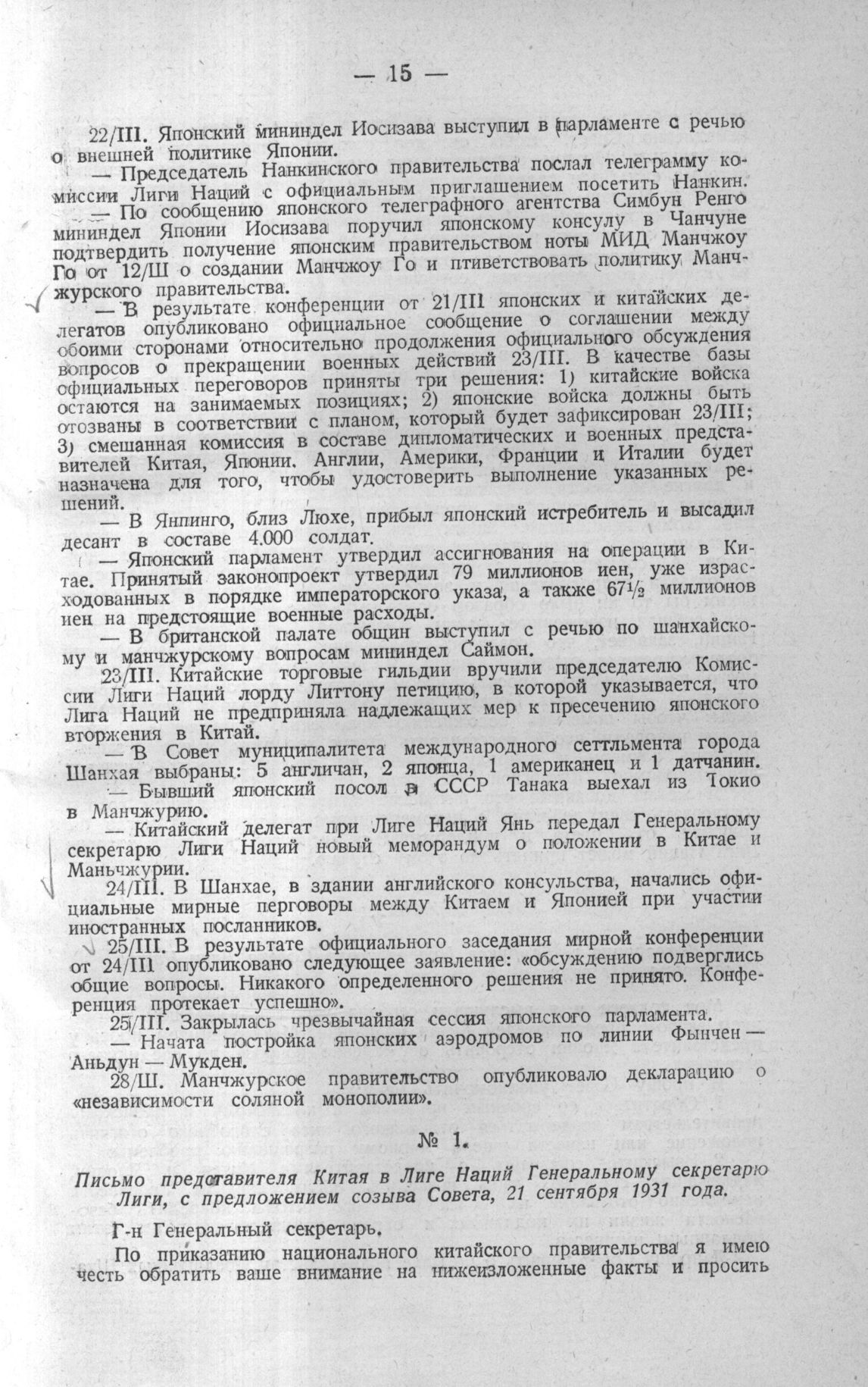 Письмо представителя Китая в Лиге Наций Генеральному секретарю Лиги, с предложением созыва Совета, 21 сентября 1931 года
