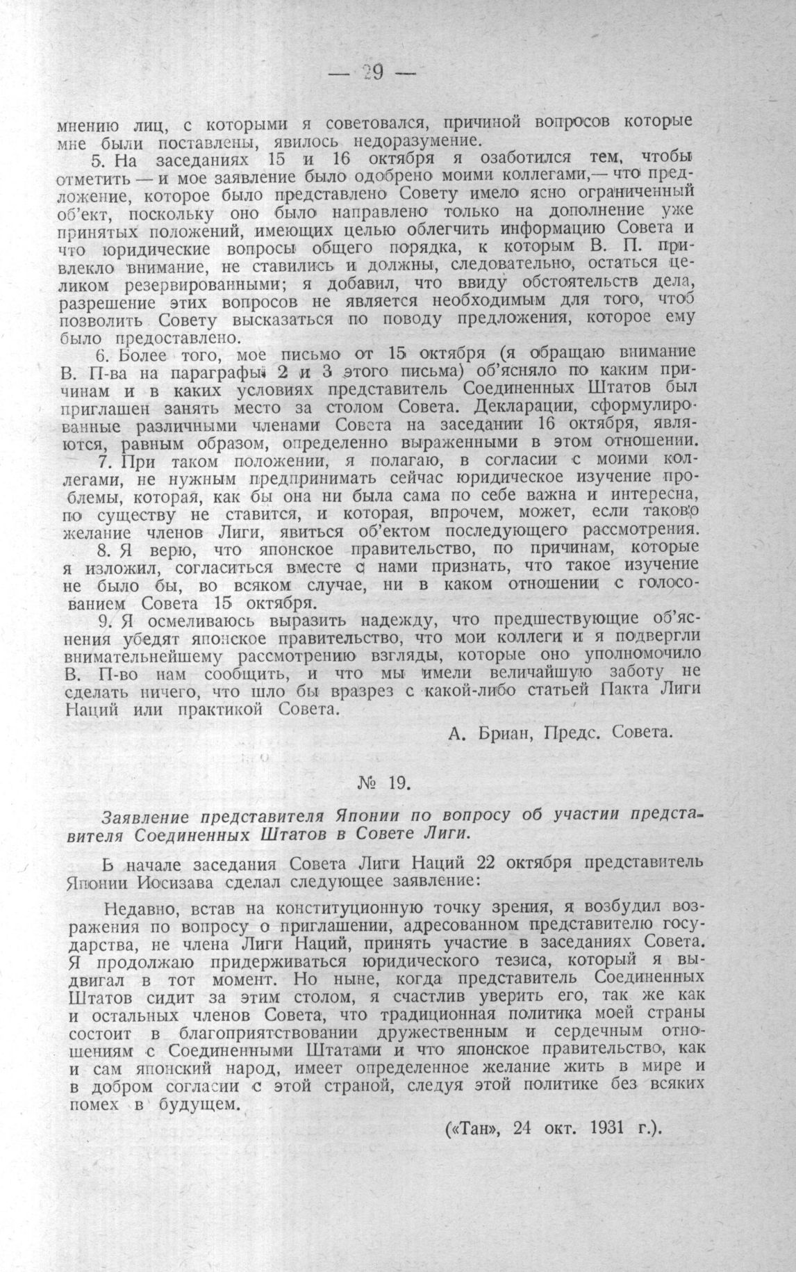 Заявление представителя Японии по вопросу об участии представителя Соединенных Штатов в Совете Лиги. // «Тан», 24 окт. 1931 г.