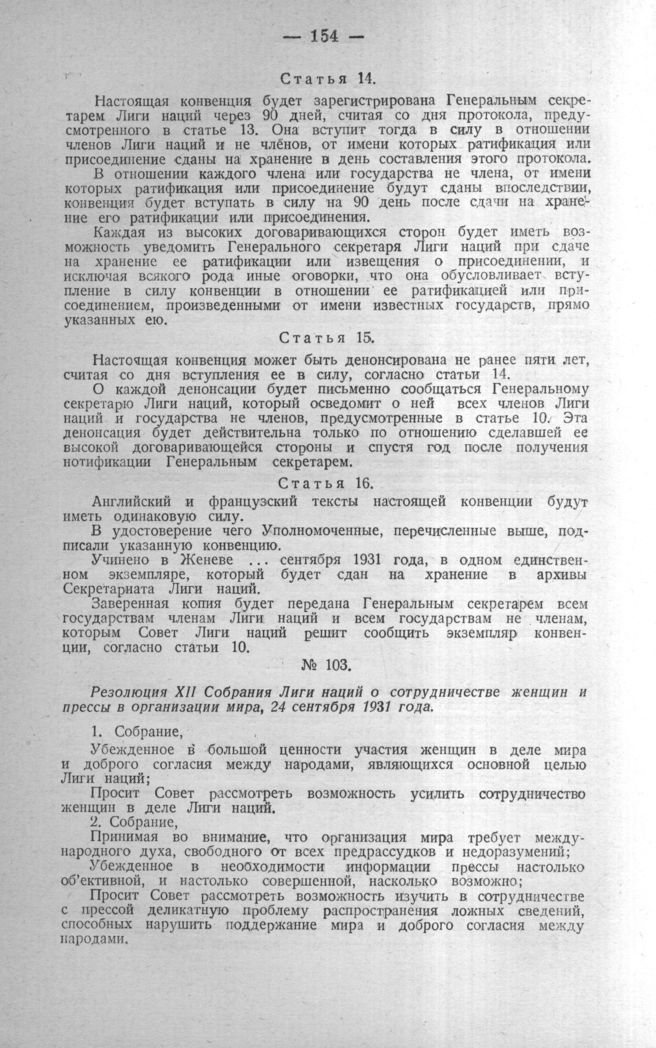 Резолюция XII Собрания Лиги наций о сотрудничестве женщин и прессы ...