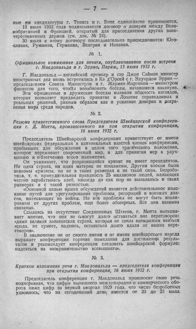 Резюме приветственного слова Председателя Швейцарской конфедерации г. Д. Мотта, произнесенного им при открытии конференции, 16 июня 1932 г.