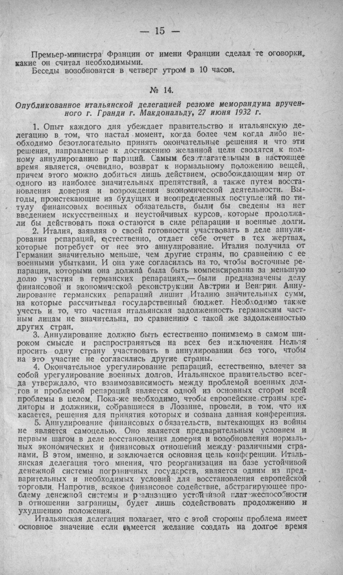 Опубликованное итальянской делегацией резюме меморандума врученного г. Гранди г. Макдональду, 27 июня 1932 г.