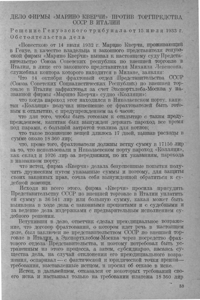 Дело фирмы «Марино Кверчи» против Торгпредства СССР в Италии. Решение Генуэзского трибунала от 15 июля 1933 г.