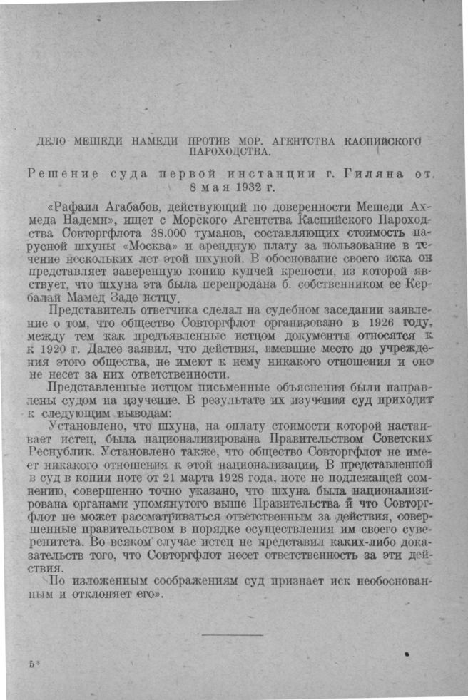 Дело Мешеди Надеми против Мор. Агентства Каспийского пароходства. Решение суда первой инстанции г. Гиляна от 8 мая 1932 г.